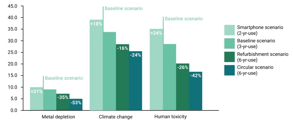 The baseline scenario has the same assumptions as the main LCA. Fairphone owners use their phones on average for 3 years. So over 6 years, they would need to buy two phones.