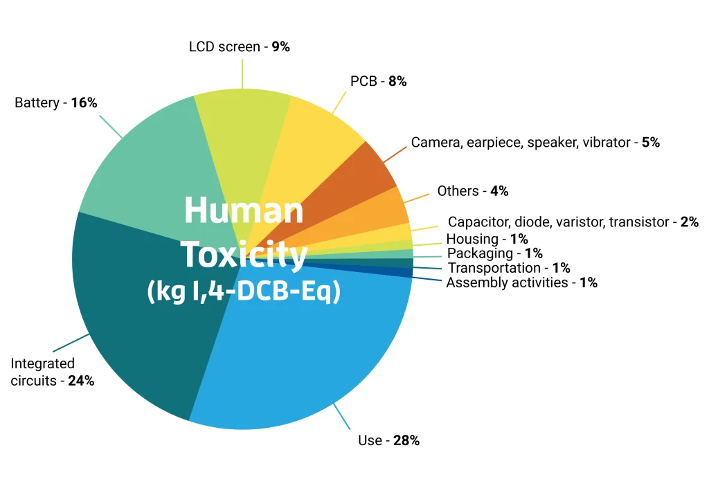 The highest contributors are the integrated circuits (24%), battery (16%), LCD screen (9%) and PCB (8%). The use phase is also responsible for 28% of the human toxicity. The transportation and recycling phases have very low contributions – about 1% in total.