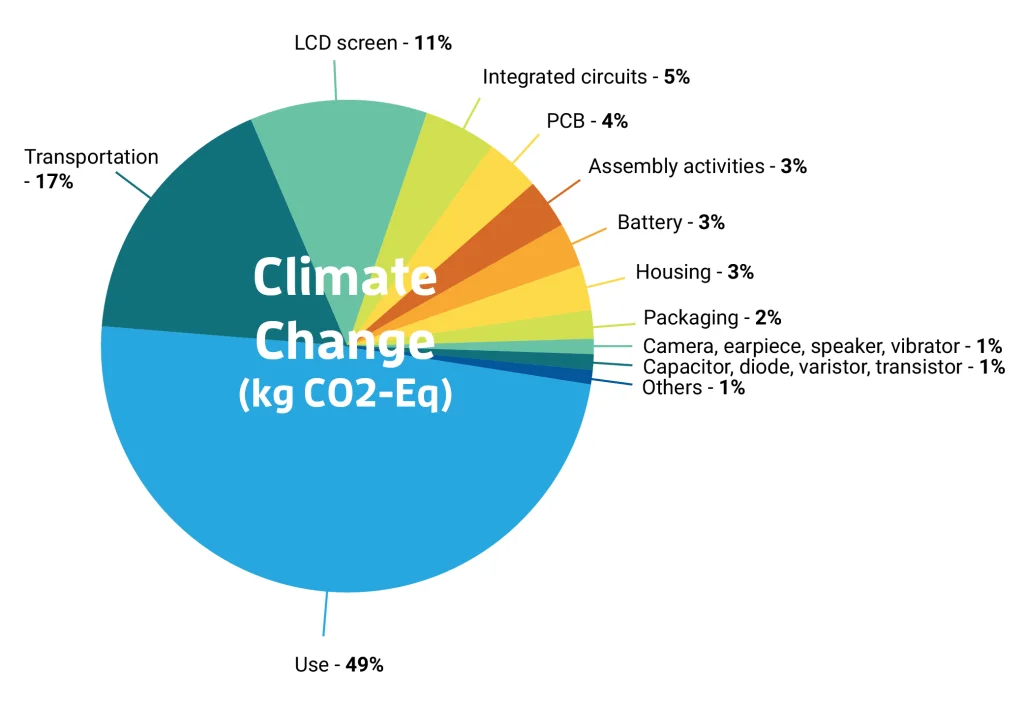 Nearly 50% of the greenhouse gas emissions come from the electricity used to charge the phone during the 3-year usage scenario.