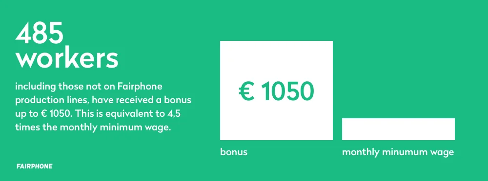 We started this in September 2019. In just over a year, more than 485 workers, including those not on Fairphone production lines, have received a bonus up to EUR1,050. This equals more than 4 months of extra salary, or in other words, a salary increase of 30% if you earn the legal minimum wage. By paying living wages we also address one of the root causes of excessive overtime, another systemic industry problem.
